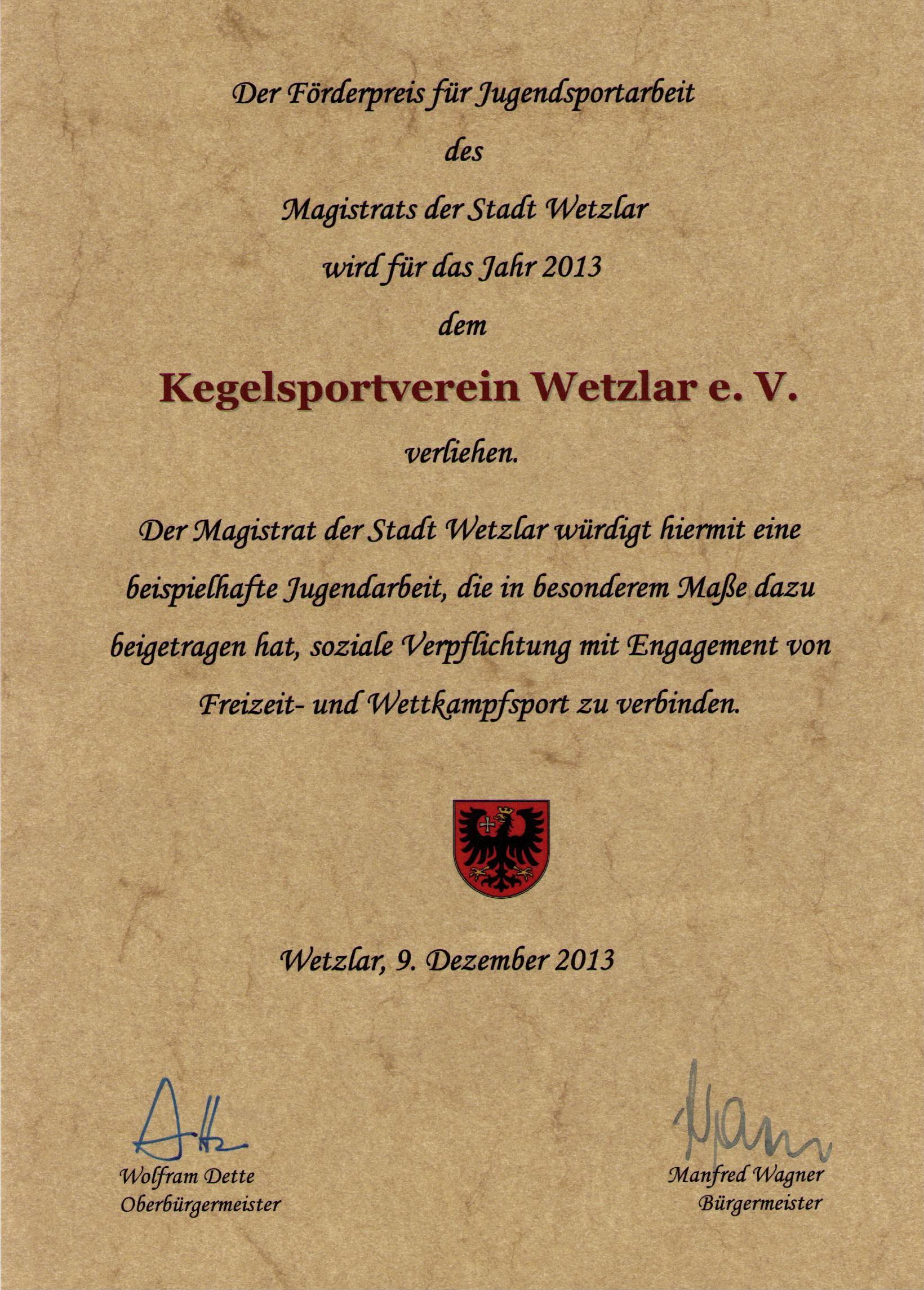 • Förderpreis für Jugendsportarbeit 2013 der Stadt Wetzlar