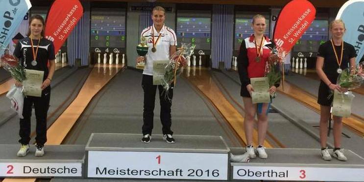 Den Zwischenlauf überstand Johanna Theiß (849) trotz Platz vier sicher und schaffte mit der überragenden Svenja Lamberth (907, Nordsaar), Katharina Schmitz (879, Aachen) und Sarah Ziemke (855) den Finaleinzug. Christina Vogel (813, Waldbrunn) schied als Siebte aus. Im entscheidenden Durchgang patzte Johanna (822) auf der ersten Bahn und geriet deutlich ins Hintertreffen. Mit einer Leistungssteigerung kämpfte sie sich noch an Sarah Ziemke (821) vorbei und sicherte sich einen Platz auf dem Treppchen. An die enteilten Katharina Schmitz (843) und die neue Meisterin Svenja Lamberth (848) kam sie aber nicht mehr heran.
