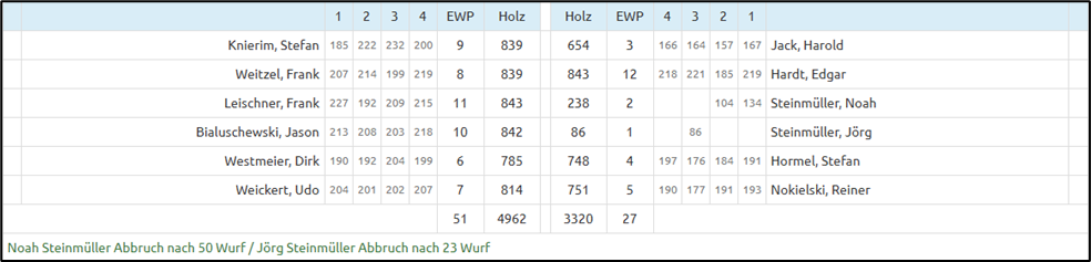 29. Sep. 2025 | von Michel Andrick | Kategorie: Aktuelle Nachrichten, Ergebnisse, Hessenliga, LigenspieleBeim KSV Baunatal stand für den KSV Wetzlar das nächste Auswärtsspiel an. Allerdings trat das Team gleich ohne drei seiner Stammkräfte an. Im Startblock hielt allerdings ein bärenstark aufgelegter Edgar Hardt gegen die Gastgeber und erzielte mit 843 die Tagesbestzahl. Damit erspielte er seinen ersten “Auswärts-12er”. Sein Mitspieler Harold Jack (654) konnte allerdings keineswegs mit den Gastgebern Stefan Knierim (839) und Frank Weitzel (839) mithalten. Im Mittelblock schickten die Domstädter das Vater-Sohn-Gespann Jörg (86) und Noah Steinmüller (238) auf die Bahn, die allerdings vorzeitig ihren Durchgang abbrechen mussten. Auf Baunataler Seite spielten Frank Leischner (843) und Jason Bialuschewski (842) und bauten dadurch die Führung der Heimmannschaft aus. Auch im Schlussblock konnten Stefan Hormel (748) und Reiner Nokielski (751) keine Wertungen gegenüber Dirk Westmeier (785) und Udo Weickert (814) holen und somit verlor der KSV mit 0:3 und trat ohne Punkte die Heimreise an.