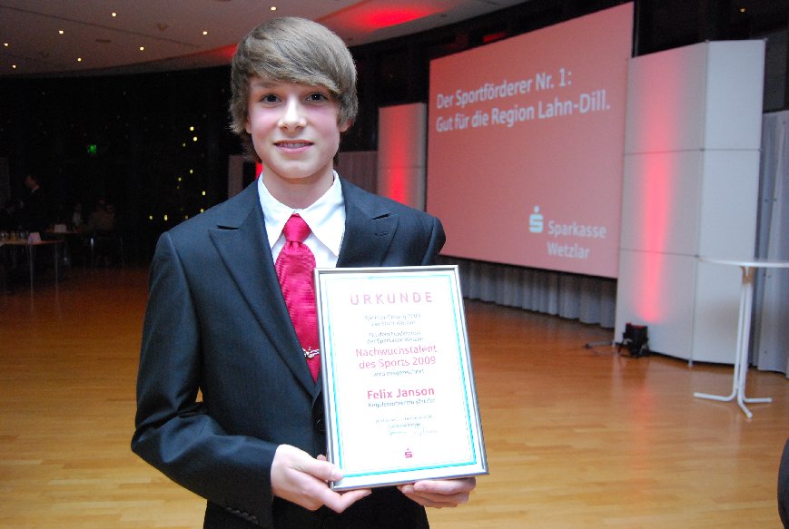 forderpreisnachwuchstalent2009felixurkundeBei der Sportlerehrung 2009 der Stadt Wetzlar wurde Felix Janson mit dem Förderpreis „Nachwuchstalent des Sports 2009“ ausgezeichnet!