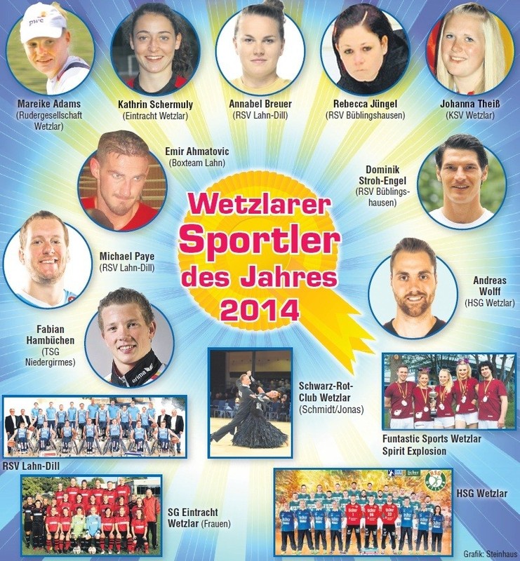 Die Sportlerehrung der Stadt Wetzlar in Kooperation mit der Sparkasse Wetzlar und dem Sportkreis Lahn-Dill findet am 8. Dezember 2014 statt. Welche Sportlerinnen, Sportler und Mannschaften in den unterschiedlichsten Sportarten hier für ihre herausragenden nationalen und internationalen sportlichen Erfolge geehrt werden, wird wie in den Vorjahren durch die öffentliche