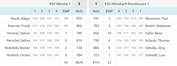 KSG Hönebach-Ronshausen. Im Startblock zeigten die Gastgeber in Form von Frank Koerner (866) und Edgar Hardt (879) gegenüber Toni Neuman (791) und Sebastian Knoth (783) starke Leistungen und erspielten einen sicheren Vorsprung von 171 Holz. Auch im Mittelblock zeigten Selina Petschel (810) und Stefan Hormel (799) gute Ergebnisse hielten gegen die Gäste gut dagegen. Zwar blieb Thomas Schaub (798) unter den Vorgaben, aber sein Mannschaftskollege Rene Sufin (856) ließ die Osthessen noch an den Einzelwertungspunkt glauben. Im Schlussblock taten sich allerdings Reiner Nokielski (738) und Michel Andrick (784) schwer und man gewann letztendlich gegenüber Lars Schmidt (723) und Jörg Sekulla (806) das Spiel mit 2:1 und man freute sich dennoch über den ersten Heimsieg.