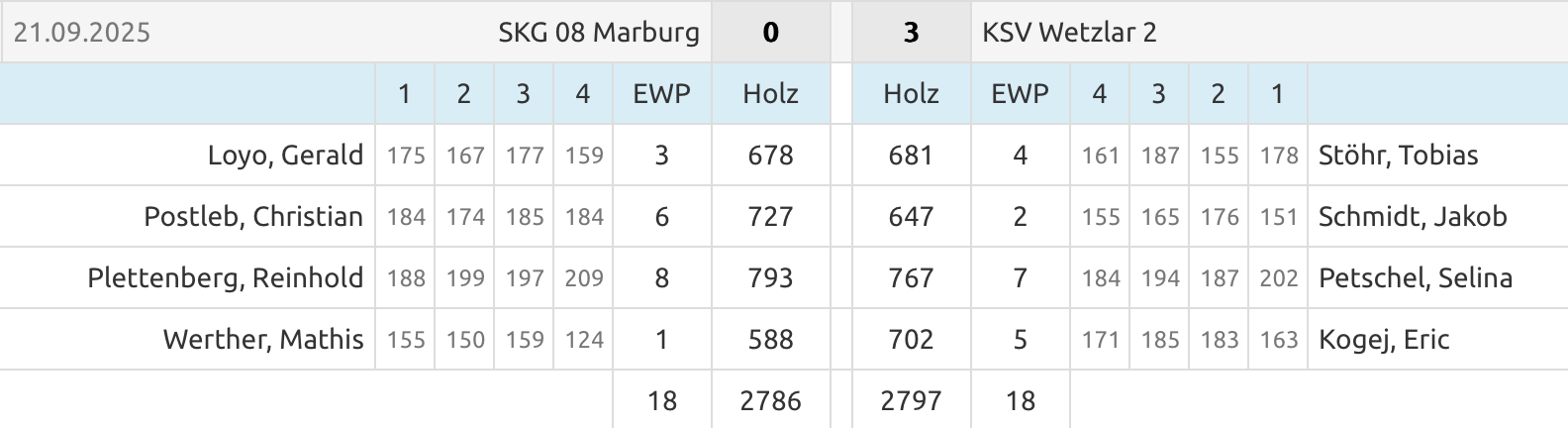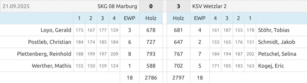 Im Gastspiel bei der SKG 08 Marburg reiste man optimistisch an, um Zählbares zu entführen. Zunächst spielten Tobias Stöhr (681) und Jakob Schmidt (647) gegen die Gastgeber Gerald Loyo (678) und Christian Postleb (727). Dabei erspielten sie bereits die erste Wertung. Im zweiten Block drehten dann Selina Petschel (767) und Eric Kogej (702), die am Tag zuvor noch in der Hessenliga spielten, auf und das Spiel kippte zu Gunsten der Wetzlarer. Auf Seiten der Marburger erzielte Reinhold Plettenberg (793, Tagesbestzahl) und Mathis Werther (588), jedoch gewannen die Domstädter das Spiel mit 9 Holz Vorsprung und einem 3:0.
