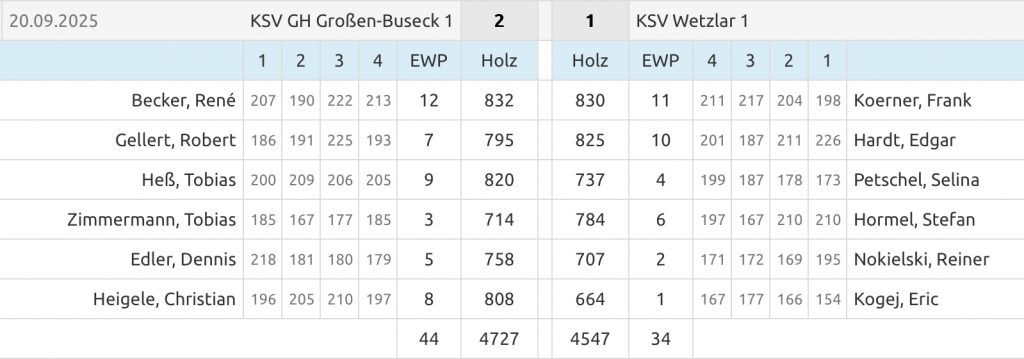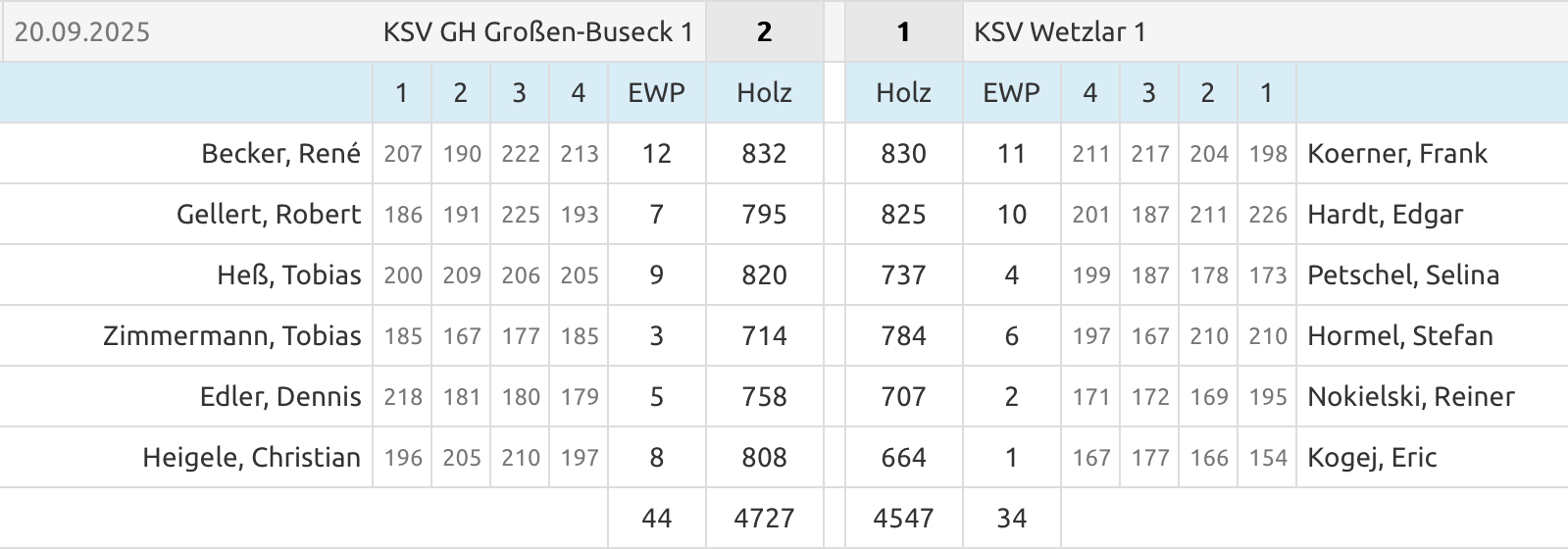 23. Sep. 2025 | von Michel Andrick | Kategorie: Aktuelle NachrichtenAm 4. Spieltag der Hessenliga traten die Domstädter beim KSV GH Großen-Buseck und strebten gegen anfällige Gastgeber den Auswärtspunkt an. Zunächst starteten Edgar Hardt (825) und Frank Koerner (830) und spielten gegen René Becker (832) und Robert Gellert (795, nach 60 Wurf durch Mandy Schneider ersetzt) eine 28 Holz Führung heraus. Im Mittelblock holten Selina Petschel (737) und Stefan Hormel (784) gegenüber Tobias Heß (820) und Tobias Zimmermann (714) wichtige Wertungen. Im Schlussblock spielten Reiner Nokielski (707) und Eric Kogej (664), der sein Hessenligadebüt feierte und den verhinderten Michel Andrick ersetzte. Da ihre Blockgegner Dennis Edler (758) und Christian Heigele (808) nicht über die Wetzlarer Vorgaben aus dem Startblock kamen, ging der Punkt an die Gäste und der KSV GH Großen Buseck gewann 2:1.