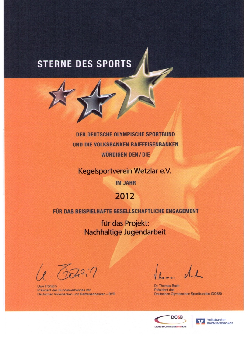 30. Aug. 2012 | von ThoWo | Kategorie: Jugend, Lesenswertes & WichtigesDie „Sterne des Sports“ sind eine Auszeichnung, die vom Deutsche Olympische Sportbund (DOSB) und die Volksbanken Raiffeisenbanken an Sportvereine für ihr soziales Engagement vergeben wird und mit Geldprämien kreative, innovative Maßnahme in Bereichen wie Gesundheit, Jugendarbeit, Integration, Gleichstellung würdigt. (www.sterne-des-sports.de)