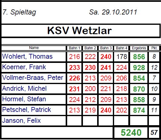 29. Okt. 2011 | von ThoWo | Kategorie: Aktuelle NachrichtenAm 7. Spieltag der Hessenliga knackte die 1. Herrenmannschaft beim Kantersieg über die KSG Kassel den Bahnrekord mit 5240. Maßgeblichen Anteil hatte Frank Koerner, der mit 928 Holz auftrumpfte. Die weiteren Ergebnisse zwischen 874 und 854 bedeuteten die Höchststrafe für die Gäste.
