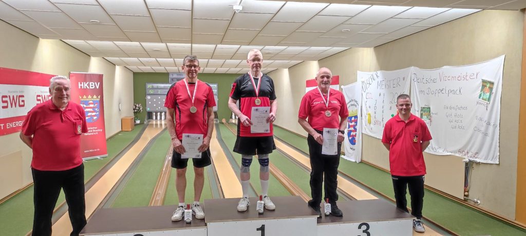 13. Mai 2024 | von Michel Andrick | Kategorie: Aktuelle Nachrichten, HessenmeisterschaftDie diesjährigen Hessenmeisterschaften in Heuchelheim und Wettenberg, die über drei Wochenenden ausgetragen wurden, fanden am vergangenen Sonntag für die heimischen Scherekegler ein erfolgreiches Ende. Zunächst startete Edgar Hardt, der bereits bei den Bezirksmeisterschaften eine gute Leistung zeigte im Herren Einzel. Allerdings fand er im Vorlauf nicht richtig in die Spur und lief mit 735 Holz seinen Erwartungen und der Qualifikation für den Endlauf hinterher. Sieger wurde letztendlich Sebastian Klöpfel mit starken 875 Holz vom KKV Kassel vor Janis Schmitt (854, SKC Waldbrunn-Hadamar) und Oliver Weller (852, PTSV Dillenburg). Im Einzel Herren B schickte der KSV gleich zwei Starter auf die Bahn. Hier dominierte zunächst Rainer Scheidt den Vorlauf mit 817 Holz auf der Anlage in Wettenberg. Sein Mannschaftskollege Reiner Nokielski hingegen tat sich schwer und landete mit 628 Holz auf dem 15. Rang. Im Endlauf eine Woche später setzte sich Scheidt knapp durch und gewann Gold mit 788 Holz vor Markus Gärtner (785, VFK Fulda) und Rolf Rohrbach (775, KSG Mittelhessen). Auch im Paarkampf der Herren rechnete sich Scheidt große Chancen auf einen Startplatz bei der deutschen Meisterschaft in Langenfeld aus, da er im Vorlauf mit Frank Koerner und 677 Holz eine starke Leistung abrufen konnte und mit Platz drei sicher im Endlauf war. Leider konnte der Start aufgrund einer privaten Verhinderung seines Partners nicht wahrgenommen werden. Den Titel im Paarkampf holten sich die Brüder Tino und Jan Anders mit 666 Holz vom KSV Wettenberg vor ihren Mannschaftskameraden Kai Uwe Schnell und Kai Göbler mit 640 Holz. Dritter wurde das Paar um Janis Schmitt und Timo Mandelik vom SKC Waldbrunn-Hadamar, die holzgleich aber mit weniger 9er Bronze gewannen.