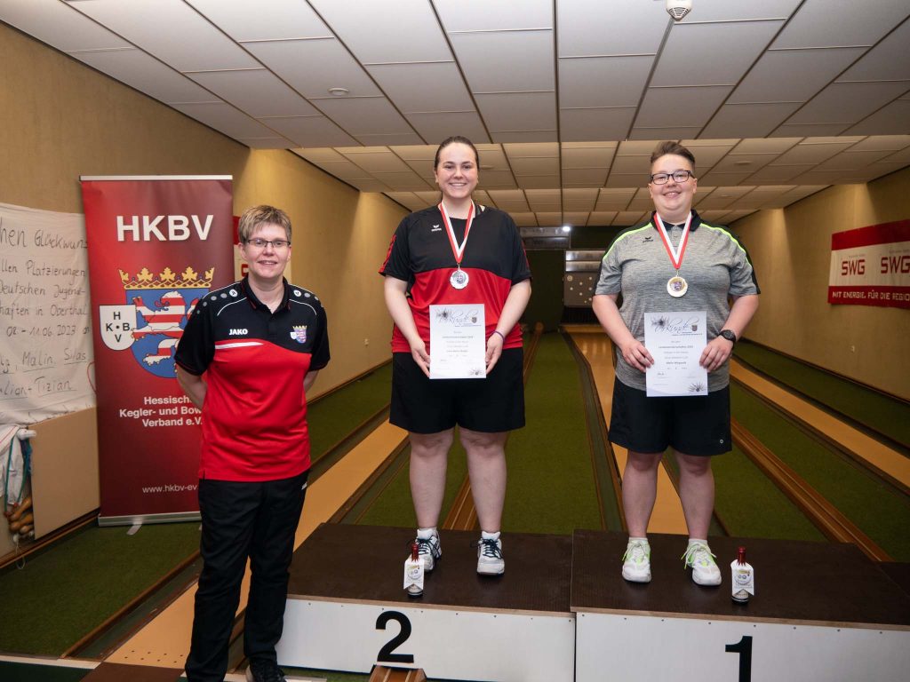 Im Einzel der Damen rechnete sich auch Jasmin Wendt Chancen auf Edelmetall aus und musste sich am Ende mit Rang 5 zufrieden stellen. Mit 728 Holz verpasste sie allerdings auch den Startplatz für Langenfeld. Siegerin wurde Sabrina Brill mit 772 Holz vor Mannschaftskollegin Ramon Wilczek mit 760 Holz. Dritte wurde Eileen Schmitt mit 747 Holz vom SKC Waldbrunn-Hadamar. Das Einzel der U24 weiblich konnte der KSV Wetzlar mit zwei Starterinnen offen gestalten. Hier wurde Luna-Marie Pfeiffer mit 675 Holz Zweite vor Evelyn Weigandt mit 654 Leistungspunkten. Erste wurde die Lokalmatadorin Malin Wiegandt vom KSC Heuchelheim mit 720 Holz. Im Paarkampf der Damen startete Evelyn Weigandt mit Jasmin Wendt. Auf der Anlage des KSV Wettenberg taten sich beide schwer und landeten mit 515 Holz auf dem fünften Platz. Sieger wurde das Wiesecker Paar Sabrina Brill und Ramona Wilczek mit bärenstarken 694 Holz weit vor Ilona Mann und Malin Wiegandt (638, KSC Heuchelheim. Bronze ging an Bundesligakeglerinnen Ann-Kristin Alexander und Luisa Stark mit 579 Holz von der KSV Wieseck.