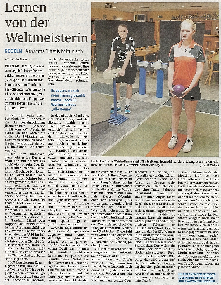 6. Feb. 2016 | von ThoWo | Kategorie: Allgemein, Lesenswertes & WichtigesMal wieder wollte ein Sportredakteur der Wetzlarer Neuen Zeitung am eigenen Körper erfahren, dass Kegeln Leistungssport ist. Kurz nach der Saison und vor Beginn der Meisterschaften traf sich Tim Straßheim mit unserer scheidenden Welt- und Deutschen Meisterin Johanna Theiß. Heraus kam eine tolle Reportage, ein Video und der obligatorische Muskelkater bei unserem Schreiberling.