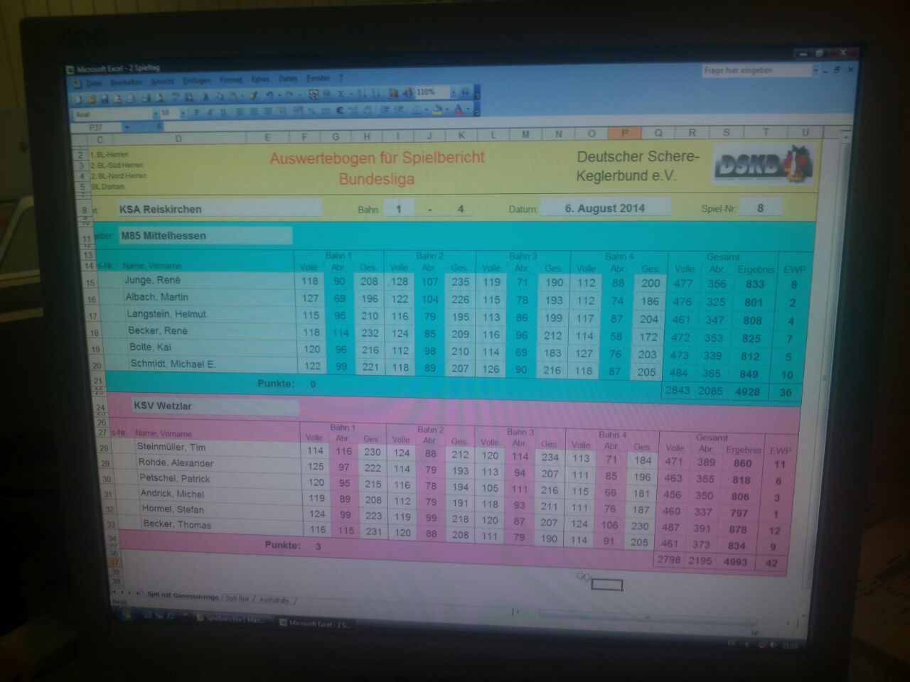 Die Mittelhessen präsentierten sich bis auf Michael E. Schmidt (849) noch nicht in Bundesliga-Form. Während die Youngster René Junge (833) und René Becker (825) noch recht sicher agierten, zeigte sich bei Kai Bolte (812), Helmut Langsten (808) und Martin Albach (801) noch Trainingsbedarf.