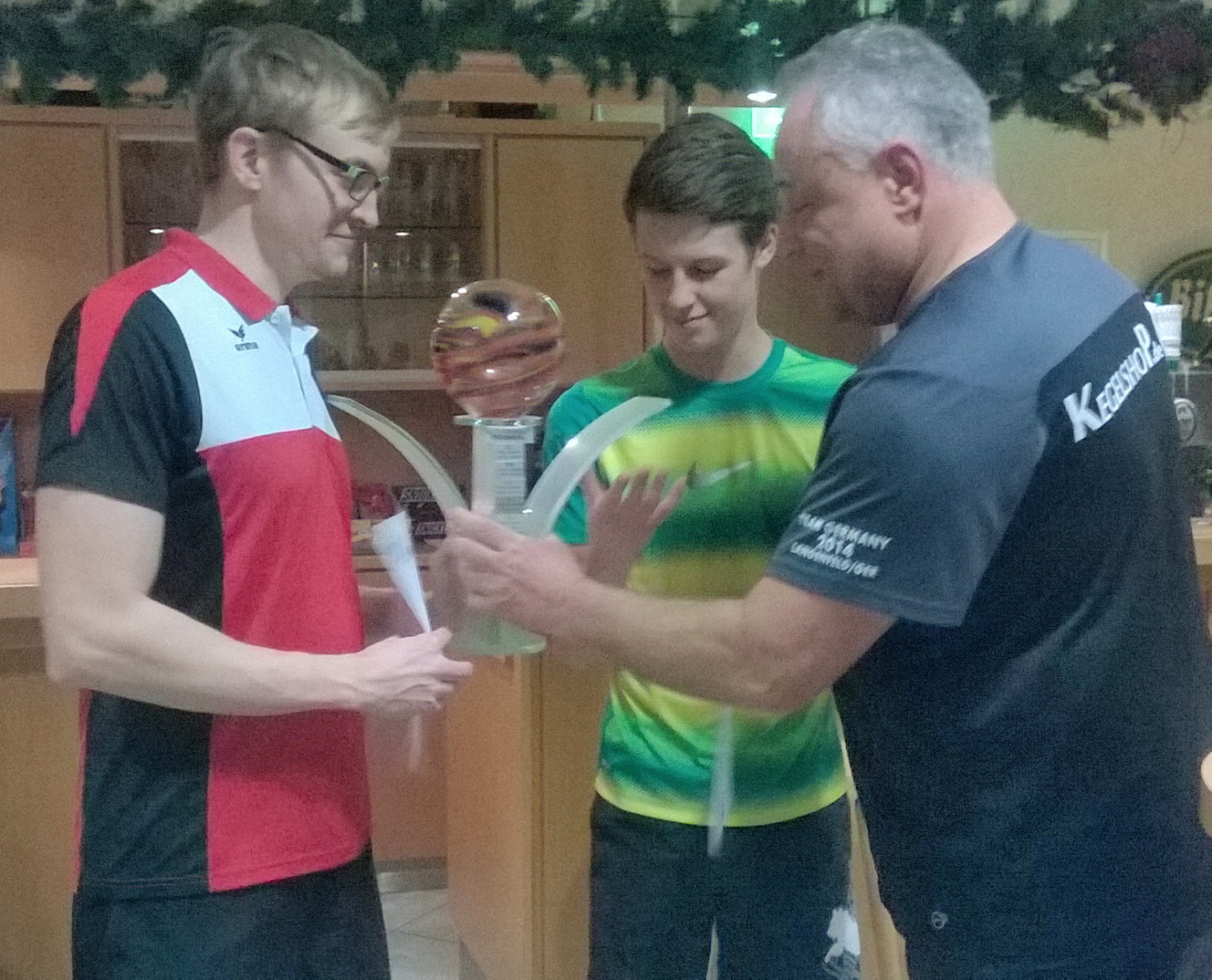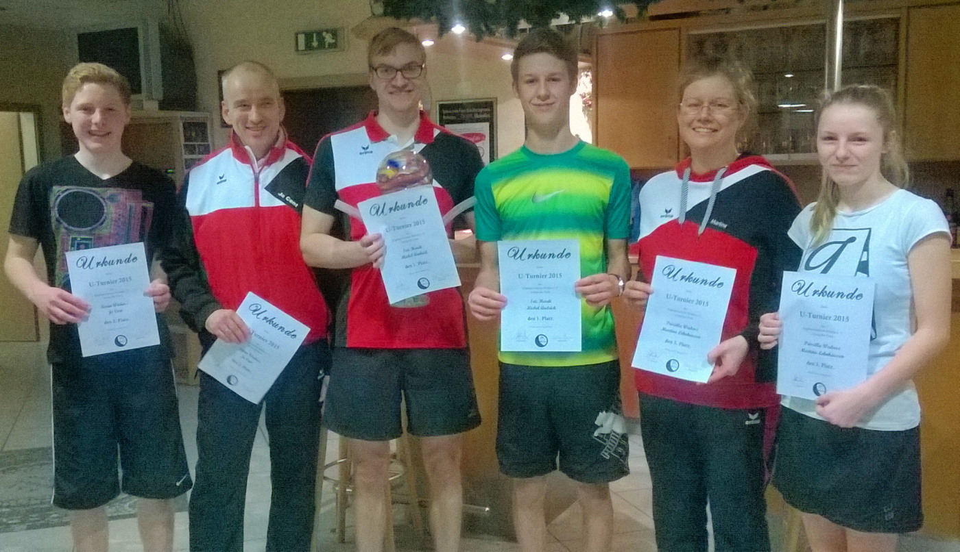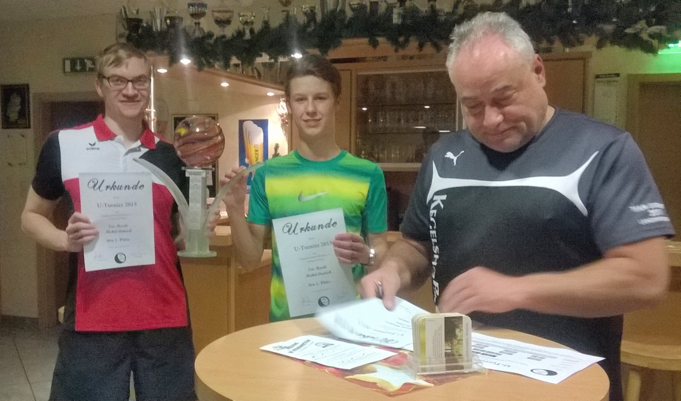 13. Dez. 2015 | von ThoWo | Kategorie: Jugend, Lesenswertes & WichtigesAuch in diesem Jahr fand wieder unser U-Turnier statt. In diesem beliebten Jugend-Erwachsenen-Paarkampf-Sprint-Wettbewerb (U 18/U 100) setzte sich Vorjahrsgewinner Eric Hardt diesmal mit Michel Andrick an die Spitze. Sie setzten sich im Finale knapp gegen Kevin Wodarz / Jörg Wehrenfennig (Jo Cent) durch, nachdem sie in der ersten Runde noch einen neuen U-Turnier-Rekord auf die Bahnen zauberten. Das Spiel um Platz 3 gewann Priscilla Wodarz / Martina Lehnhausen gegen Marie Lehnhausen / Stefan Hormel.